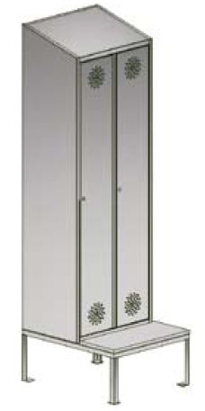 Szafa ubraniowa dwuczęściowa wykonana ze stali kwasoodpornej. Drzwi otwierane skrzydłowo, z wywietrznikami, zamykane na klucz. Wkażdej części 4 półki. Szafa wyposażona w ławeczkę. Możliwość wypoziomowania szafy.