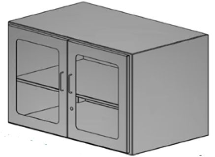 Szafka medyczna wisząca, drzwi podwójne z przeszklonym frontem, otwierane skrzydłowo. Wewnątrz jedna półka.