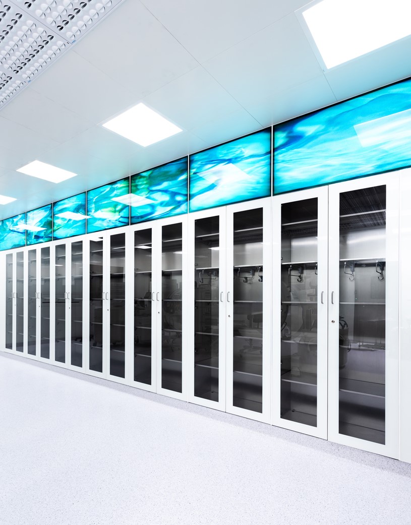 Wyjątkowa estetyka: Zabudowa modułowa tworzy nie tylko czyste, ale również atrakcyjne wizualnie, profesjonalne i uporządkowane środowisko pracy. Okna wychodzące na zewnątrz budynku lub z symulowanym widokiem na morze czy las istotnie poprawiają komfort personelu i przyśpieszają rekonwalescencję pacjentów. Czy wiesz, że ALVO Medical® była pierwszą firmą z branży technologii medycznych, która wprowadziła dzieła sztuki do sal operacyjnych? Nasz nowoczesny park maszynowy umożliwia produkcję wielkoformatowych paneli ściennych i drzwi z wybraną grafiką. Szpitale mogą wybrać nadruk z elementami sztuki, fotografii czy własnej identyfikacji wizualnej. Elementy graficzne można wkomponować w powierzchnie stalowe lub szklane, nadając pomieszczeniu prestiżowy wygląd. Odpowiednio dobrane kolory urozmaicają przestrzenie szpitalne i wpływają na dobre samopoczucie pacjentów i personelu medycznego.