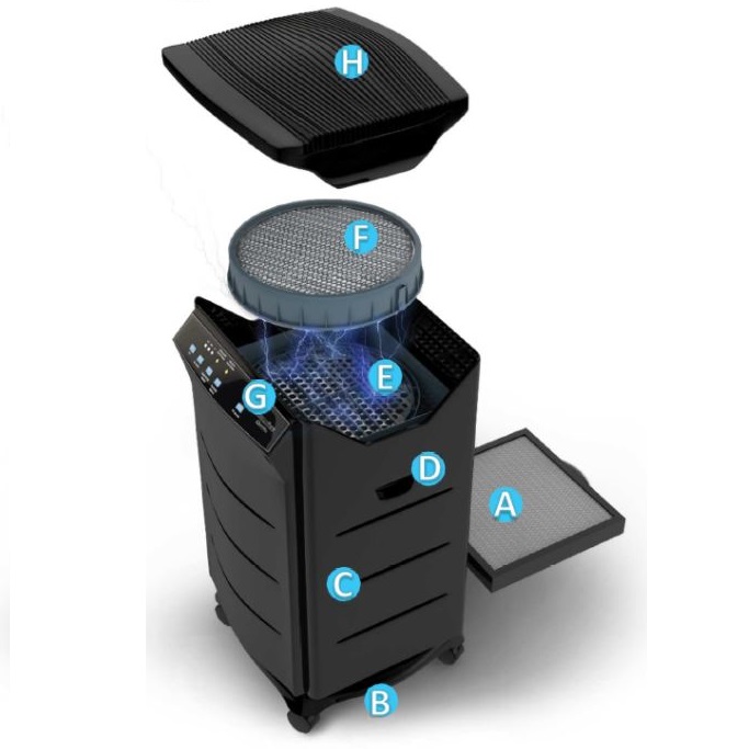 F) System filtracji (filtr główny) stopień 9 – redukcja ponad 99,99% cząstek o wielkości 0,3 mikrona. 4-krotnie większa wydajność niż w przypadku filtrów HEPA. Wychwytuje mikroorganizmy i hamuje ich rozwój, działając mikrobiostatycznie
