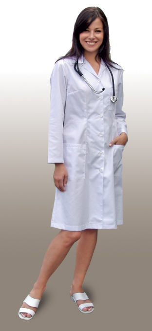 Fartuch z wykładanym kołnierzem, krótki rękaw, fason delikatnie dopasowany do sylwetki zaszewkami, trzy kieszenie, pasek z tyłu, zapinany na guziki. Fartuch dostępny również z długim rękawem oraz zapięciem na zatrzaski. Fartuch dostępny w rozmiarze: 34, 36, 38, 40, 42, 44, 46, 48, 50, 52, 54. Dla każdego rozmiaru dostępne wzrosty: 158 cm, 164 cm, 170 cm, 176 cm, 182 cm.