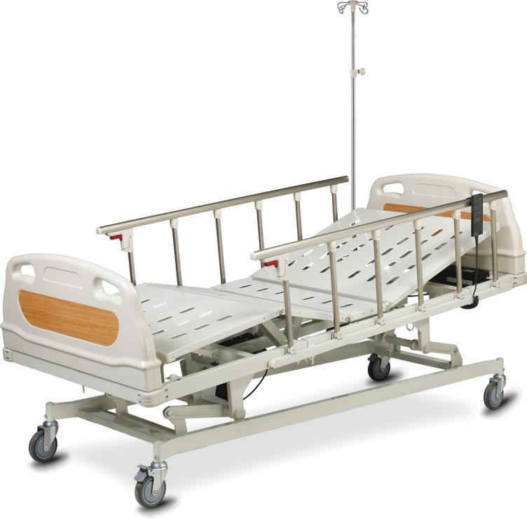 Pięciofunkcyjne elektryczne łóżko szpitalne. Rama stalowa pokryta powłoką antystatyczną i antykorozyjna. Fronty z BAS. Barierki boczne wykonane z aluminium. 4 elektromotory. Cztery 5calowe kołka (2 z hamulcem). System centralnego sterowania łóżkiem. Udźwig 280 kg. Zgodny ze standardem ISO13485-2003 CE. Akcesoria: wieszka na płyny infuzyjne z 4 haczykami, kółka, aluminiowe poręcze boczne.