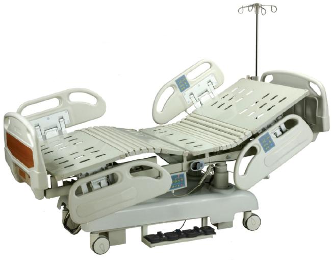 Multifunkcyjne łóżko szpitalne kolumnowe. Leże wykonane z blachy tłoczonej perforowanej lakierowane proszkowo. Barierki opuszczane w doł hydraulicznie, wykonane z PE. Szczyty łózka łatwo zdjemowalne (z ABS). 5 silników elektrycznych. 4 koła z centralnym system hamowania. Zgodne z ISO 13485:2003, CE. Powierzchnie łózka odporne na działanie środków dezynfekcyjnych. Haki na worki urologiczne, wieszak na płyny infuzyjne.