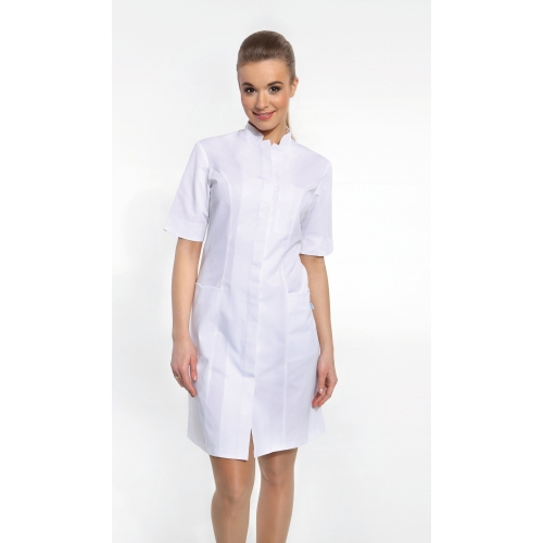 Sukienka ze stójką, zapinana na kryte napy. Dwie dolne kieszenie, jedna na piersi.