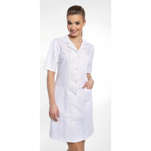 Sukienka klasyczna dopasowana, zapinana na napy. Dwie kieszenie dolne, jedna na piersi.
