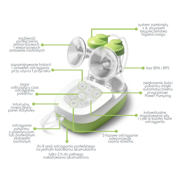 - Unikalny automatyczny program do stymulacji laktacji Power Pumping Regulacja podciśnienia oraz cykli odciągania pokarmu