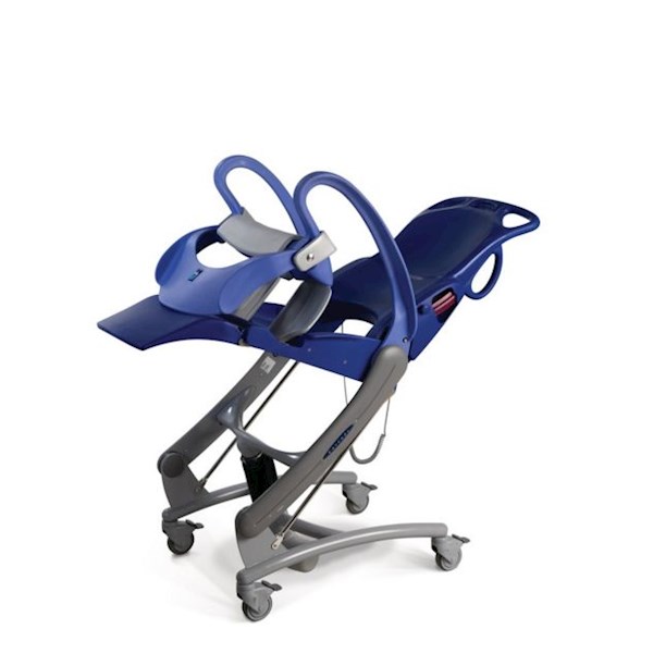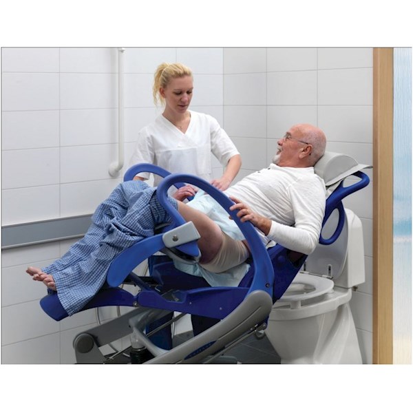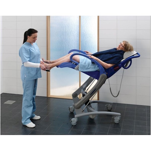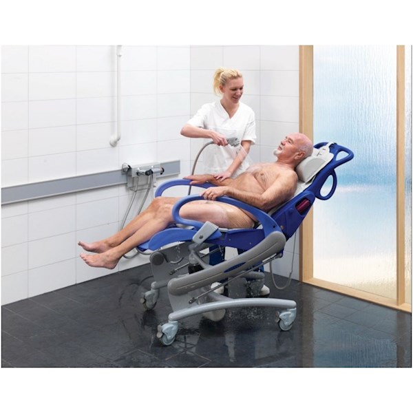 Fotel toaletowo-prysznicowy o regulowanej wysokości i pochyleniu, możliwa płynna zmiana pozycji pacjenta od siedzącej do leżącej oraz specjalna pozycja ułatwiająca zmianę pielucho-majtek; zasilany akumulatorowo, sterowany za pomocą pilota, udźwig maksymalny 136 kg. Komplet zawiera dwa akumulatory, ładowarkę, poduszkę na siedzisko, pas bezpieczeństwa, poduszkę pod kark.