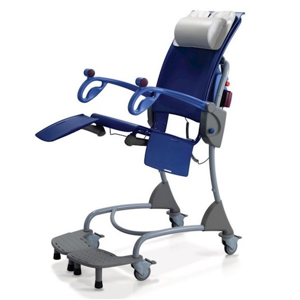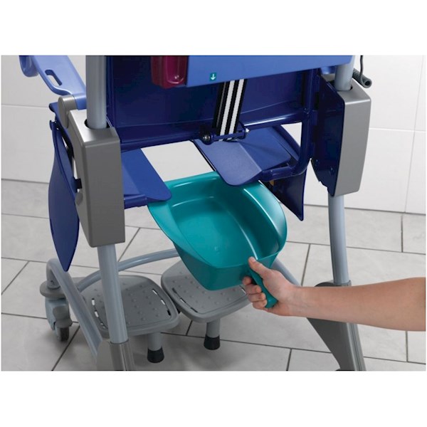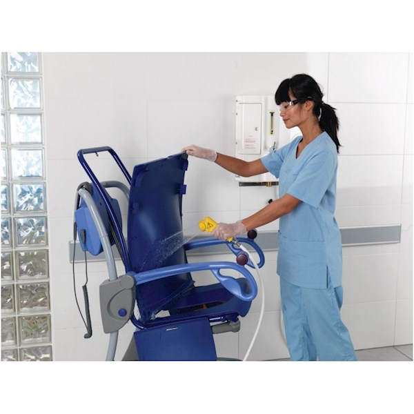 Fotel kąpielowy o regulowanej wysokości i pochyleniu, możliwa płynna zmiana pozycji pacjenta, zasilany akumulatorowo, sterowany za pomocą pilota, udźwig maksymalny 140 kg. Komplet zawiera dwa akumulatory, ładowarkę, poduszkę pod kark, pas bezpieczeństwa.