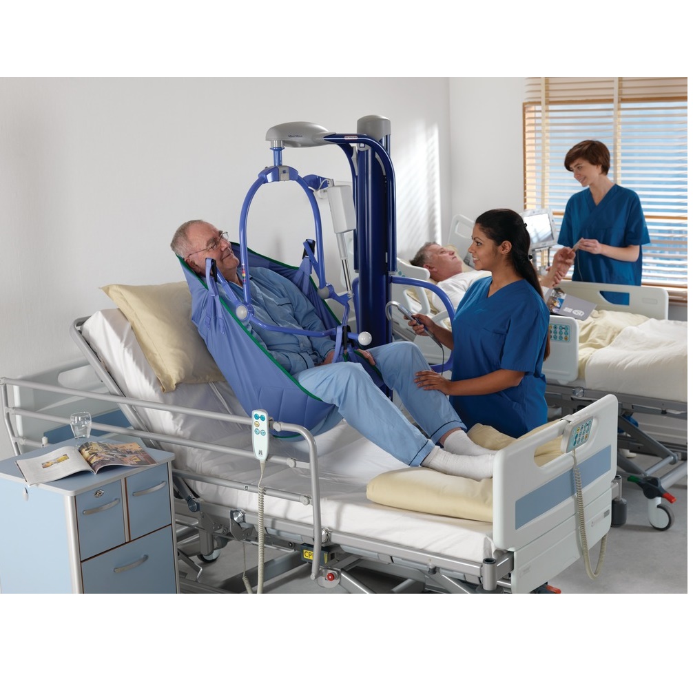 Podnośnik może być wyposażony w elektrycznie sterowaną sztywną czteropunktową ramę do zaczepiania nosideł zatrzaskowych z pacjentem w pozycji siedzącej, umożliwiającą zmianę pozycji po podniesieniu pacjenta.