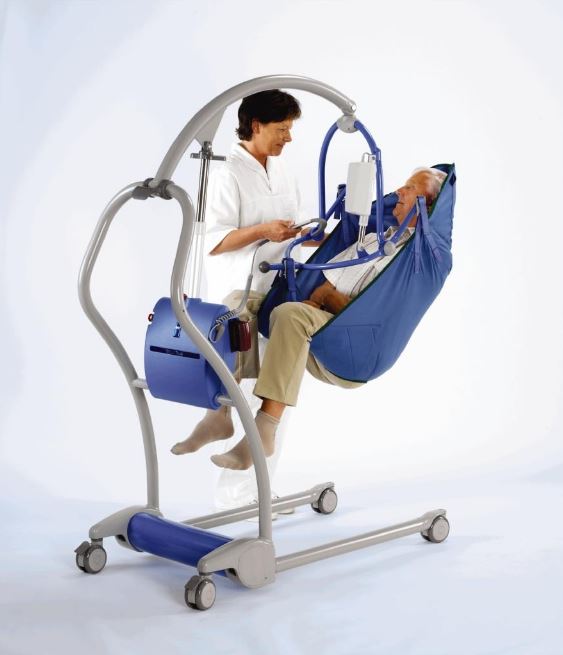 Zasilanie akumulatorowe, dwukolumnowy maszt zapobiegający kontaktowi ze stopami pacjenta.