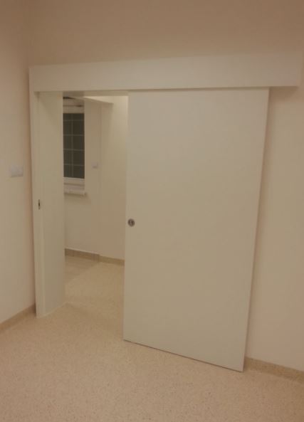 Drzwi RTG przesuwne wykonane z płyty wiórowej laminowanej (pełne) na solidnym systemie jezdnym wytrzymującym udźwig 200kg. Drzwi wyposażone w zamek hakowy. Ościeżnica regulowana na szerokość muru.