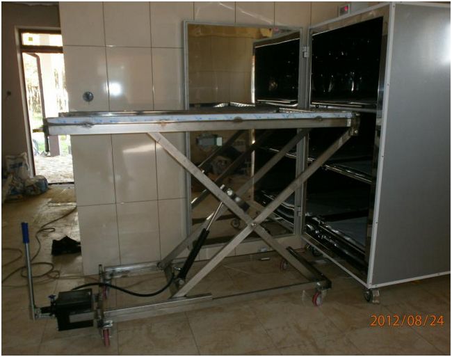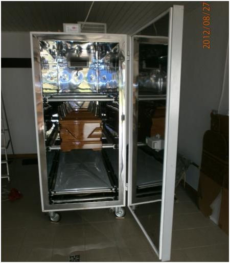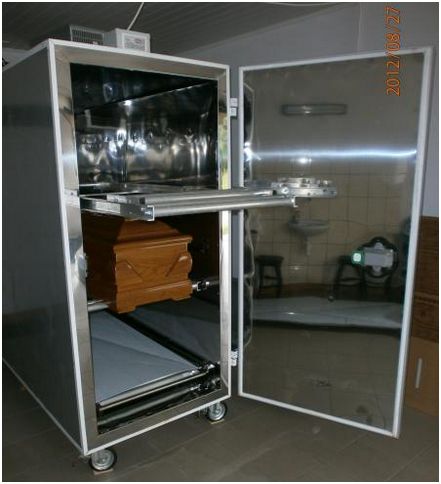Komory chłodnicze wykonane są z paneli wypełnionych materiałem izolacyjnym. Wewnętrzna powierzchnia komory pokryta jest blachą nierdzewną H17, zewnętrzna – blachą ocynkowaną, lakierowana w dwóch kolorach (biała, srebrna). Wewnątrz komory znajdują się wózki zasadnicze i pomocnicze umożliwiające wygodne wsuwanie i wysuwanie trumien lub tac. Tace wykonane ze stali kwasoodpornej są dodatkowym wyposażeniem komory(cena tacy- 750,00zł netto),służą do przenoszenia ciał i przechowywania ich w komorze. Drzwi komory zamykane są na zamek zatrzaskowy zamykany na klucz z możliwością otwarcia go od środka. Wewnątrz komory na jej tylnej ścianie instalowana jest chłodnica powietrza, na dachu, z tyłu lub z boku komory montowany jest agregat chłodniczy. Agregaty zasilane są prądem jednofazowym o napięciu 230V i częstotliwości 50Hz. Zespół instalacji chłodniczej i elektrycznej zapewnia automatyczną realizację procesu chłodzenia i utrzymywania zadanej temperatury w zakresie od 0ºC do +10ºC.