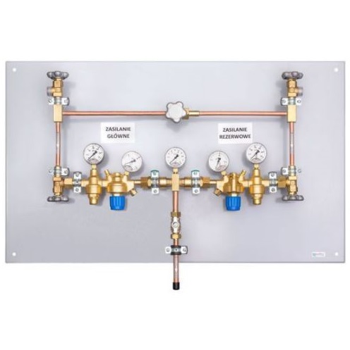 Zadaniem tablicy redukcyjnej niskiego ciśnienia jest redukcja i utrzymanie stałego ciśnienia gazu ze stacji butli. tablica redukcyjna wyposażona jest w dwa reduktory z zaworami bezpieczeństwa, zawory kulowe, rury miedziane grubościenne zwane też łącznikiem rampowym.