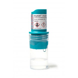 BiopSafe eliminuje problematyczne pojemniki na formalinę i uchwyty naścienne, których obsługa często powoduje ulatnianie się tej substancji. System składa się z niewielkiego, łatwego w użyciu zbiorniczka (fiolki) z formaliną zamkniętą w nakrętce.