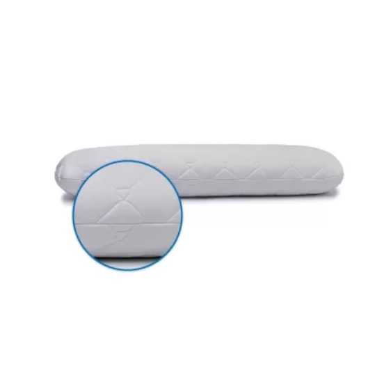 Wielozadaniowa poduszka w kształcie wałka, wypełniona granulatem z certyfikowanej pianki.