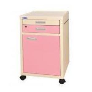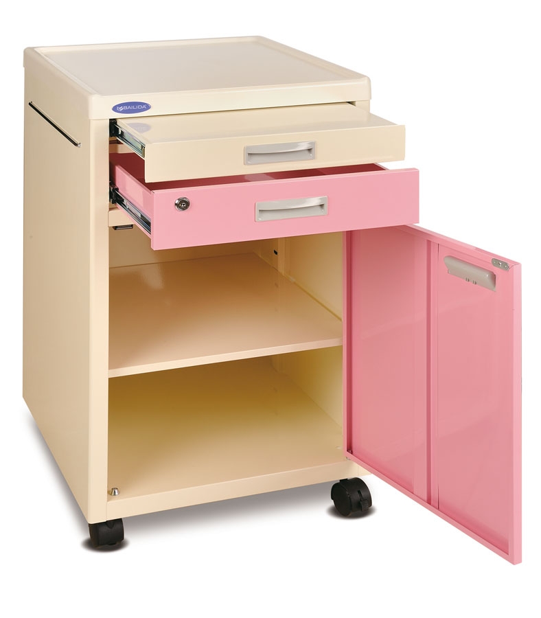 Szafki przyłóżkowe Bailida z metalowym korpusem malowanym proszkowo. Blat szafki wykonany z tworzywa ABS. Jedna szuflada zamykana na klucz. Po obu stronach uchwyty na ręczniki ze stali nierdzewnej. Szafka na kółkach ułatwiających odsuwanie.