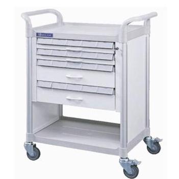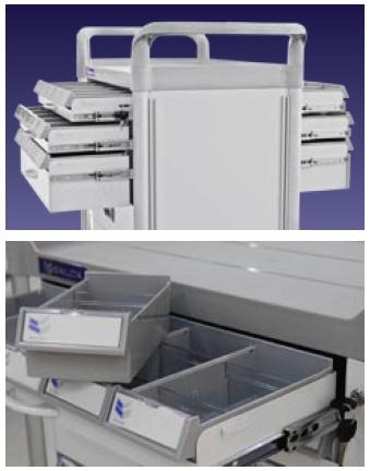 Wózki medyczne FC DXL posiadają możliwość dwustronnego otwierania szuflad, w których znajdują się wyjmowane pojemniki. Wyśmienicie nadają się do przewozu i przechowywania leków. Blat i rączki boczne wózka wykonano z wytrzymałego plastiku PP (POLIPROPYLEN), a ramę z aluminium. Dwie szuflady wykonane są z tworzywa ABS. Wózek medyczny posiada 4 niebrudzące kółka (100mm) z tworzywa TPR (antystatyczne) z których dwa posiadają hamulec. Centralny zamek po obu stronach wózka. Wózek posiada wyjmowane pojemniki z możliwością dzielenia (10 pojemników wys. 75mm; 10 pojemników wys. 154mm po jednej stronie wózka).