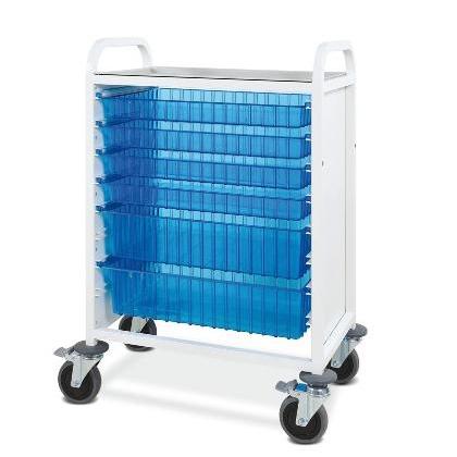 Otwarty wózek do przewozu leków. Szuflady umieszczone w jednej kolumnie. Wózek z niebieskimi tacami a tworzywa ABS. tace o różnych wysokościach, z możliwością otwierania z dwóch stron. Wózek z odbojnikami przy kółkach. Specialnie zaprojetowane odbojniki chronią użytkownika i wózek.