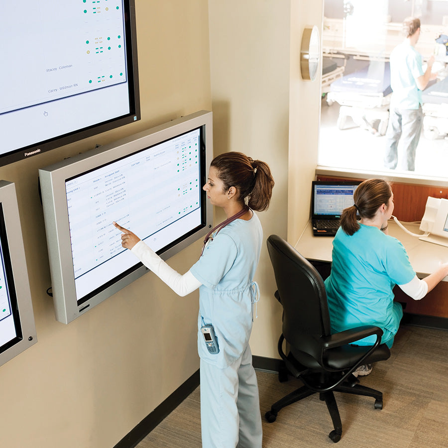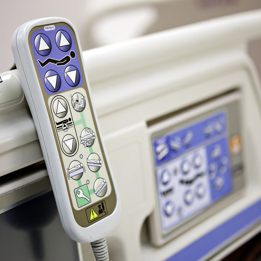 - Regulowany kąt nachylenia dotykowego interfejsu graficznego dla personelu medycznego (GCI) pozwala na wygodne operowanie funkcjami łóżka, ustawianie ich sekwencji oraz programowanie cykli