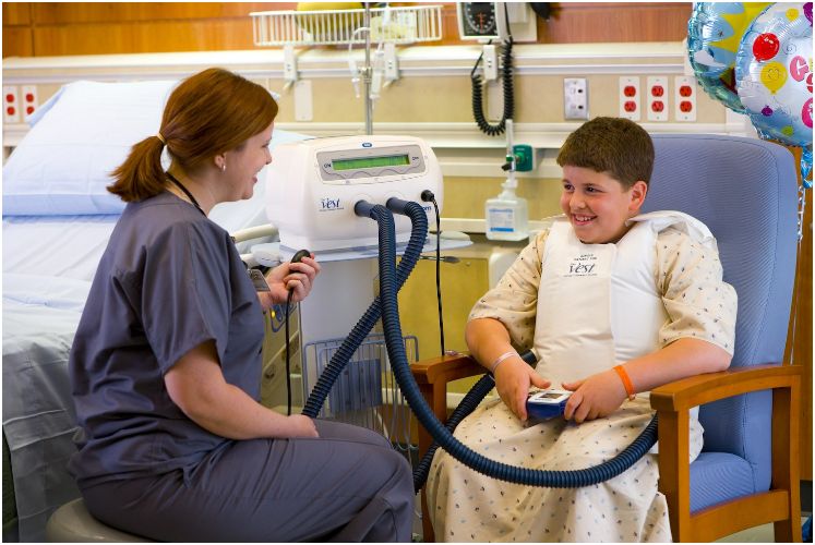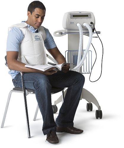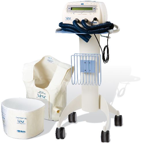 Unikalny system wspomagający aktywację wydzieliny płucnej poprzez wysokiej częstotliwości oscylację ściany klatki piersiowej. System The Vest® składa się z nadmuchiwanej kamizelki połączonej przewodami z generatorem impulsów powietrza. Generator z wysoką częstotliwością nadmuchuje kamizelkę i wydmuchuje z niej powietrze, na przemian uciskając i zwalniając ucisk klatki piersiowej. Technologia ta nosi nazwę wysokiej częstotliwości oscylacji ściany klatki piersiowej (HFCWO). Szybkie ruchy klatki piersiowej imitują "drobne kaszlnięcia", dzięki którym śluz się przesuwa i rozrzedza, co umożliwia przesunięcie go w kierunku głównych dróg oddechowych. Terapia The Vest® traktuje wszystkie płaty płuc jednakowo i jest niezależna od zastosowanej techniki. Może być ona korzystna dla pacjentów w różnych dziedzinach opieki medycznej, w tym na oddziałach intensywnej terapii oraz pourazowych, ale także w domu. CHOROBY I SCHORZENIA Stosowanie systemu The Vest® jest zalecane w przypadku powikłań oddychania związanych m.in. z następującymi chorobami i schorzeniami: Mukowiscydoza (zwłóknienie torbielowate), Rdzeniowy zanik mięśni (MSA) Stwardnienie zanikowe boczne, Dziecięce porażenie mózgowe, Przewlekła obturacyjna choroba płuc (POChP), Dystrofia mięśni, Przeszczepione płuco, Zależność od wentylacji mechanicznej. Prosty w obsłudze generator impulsów powietrza Dzięki możliwości ustawienia częstotliwości i intensywności oscylacji przy pomocy przycisków umieszczonych na generatorze, możliwe jest dostosowanie terapii do indywidualnych klinicznych wymagań dla konkretnego pacjenta. Ustawienia całkowitego czasu trwania terapii pozwalają na konfigurację długości sesji terapeutycznej, po której zakończeniu generator impulsów powietrza automatycznie się wyłączy. W innym wypadku, gdy terapia zostanie przerwana, licznik wskaże pozostały do końca terapii czas, by zapewnić jej realizację w przepisanym wymiarze. Bogaty wybór kamizelek The Vest® W systemie The Vest® istnieje wyjątkowa możliwość wyboru kamizelek, spełniających specyficzne wymogi kliniczne. W środowisku opieki krótkoterminowej, gdzie szczególny nacisk kładziony jest na zapobieganie infekcjom, dostępny jest wachlarz piersiowych i pełnych kamizelek, przeznaczonych dla tylko jednego pacjenta. Jeśli natomiast terapia ma być prowadzona w domu wówczas dostępny jest wybór spośród piersiowych i pełnych kamizelek wielorazowego użytku.