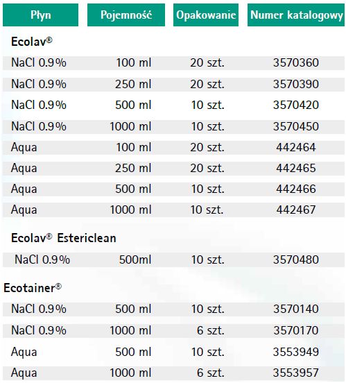 Płyny z opakowań Ecolav/Ecotainer służą do przepłukiwania i oczyszczania podczas interwencji chirurgicznej. Przemywanie ran i oparzeń. Zwilżanie tamponad i opatrunków. Przepłukiwanie i oczyszczanie cewników dopęcherzowych. Przepłukiwanie i oczyszczanie w opiece stomijnej.