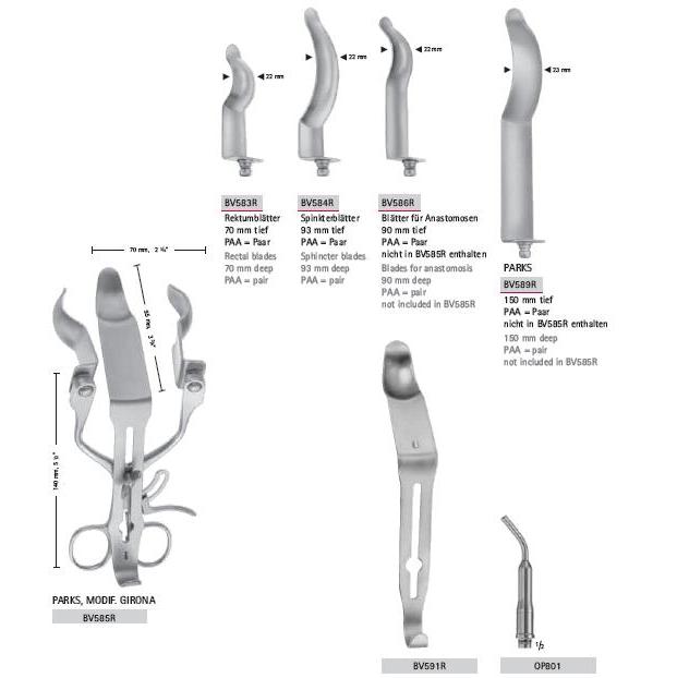 Rozwieracz odbytniczy, w skład zestawu wchodzi: BV581R rozwieracz, BV582R centralne ostrze, BV583R/BV584R para ostrzy. Wymiary 140 mm x 70 mm x 95 mm.