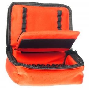Ampularium małe. Posiada taśmy na 24 ampułki, po środku przekładka na strzykawki, kaniule itp., przezroczysta kieszeń na klapie torby, wyściełane pianką, z poliestru.
