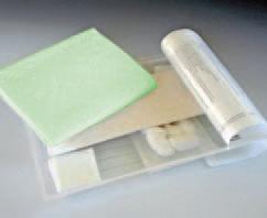 Tupfery kule 20 cm x 20 cm – 5 szt.; przylepiec włokninowy hypoalergiczny 1,25 cm x 18 cm – 6 szt.; kompresy gazowe 8 warstwowe 5 cm x 5 cm – 5 szt.; podkład chłonny 60 cm x 40 cm – 1 szt.; rękawice lateksowe zabiegowe bezpudrowe rozm. M – 2 szt.