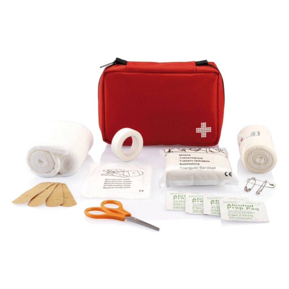 Apteczka 24 el. w pokrowcu na zamek błyskawiczny, wewnątrz: bandaż, rękawiczki medyczne, nożyczki i taśma w pokrowcu nylonowym, zapakowana apteczka mieści się w skrzynce pocztowej, spełnia wymagania normy EN13485:2003