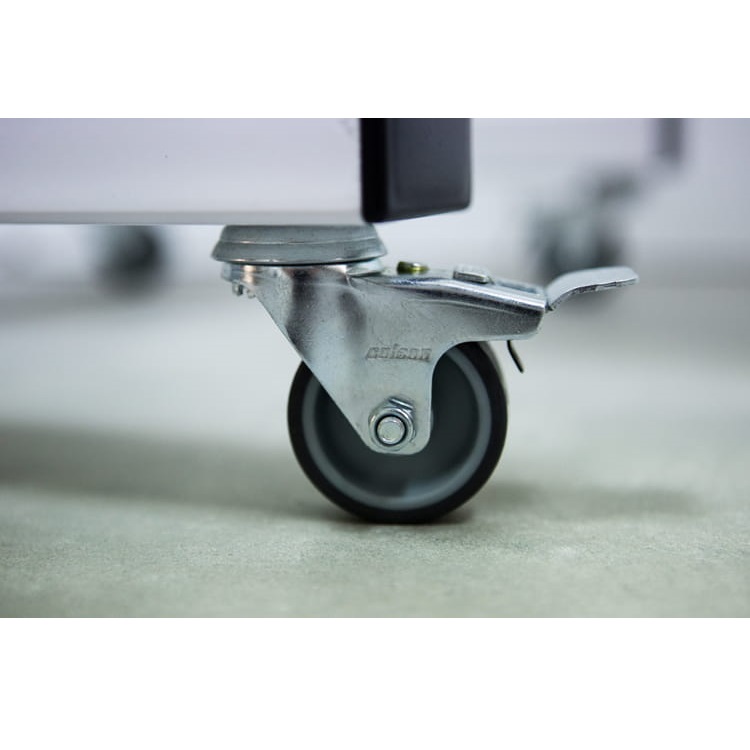 Wykonany ze stali, posiada kółka wykończone gumą. Dwa kółka obrotowe z hamulcem. W zestawie plastikowy pojemnik na akcesoria oraz uchwyt do kabli EKG (chwyt dostępny w modelu do aparatów EKG). Ergonomiczna rączka ułatwia przemieszczanie wózka