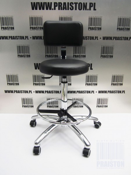 Nowy, powystawowy, Produkcji polskiej (2021r.), Nowa tapicerka z atestem medycznym w kolorze czarnym (możliwość wymiany tapicerki z naszego wzornika kolorów za dodatkową opłatą), Posiada stabilną aluminiową podstawę i wygodne tapicerowane siedzisko oraz praktyczny podnóżek, Regulacja wysokości odbywa się za pomocą sprężyny gazowej, Wyposażony jest w oparcie pleców o wymiarach 35 x 20 cm, Mobilny na kółkach, Parametry Techniczne: Wysokość: 64 - 89 cm, Podstawa: ø 65 cm, Siedzisko: ø 35 cm, Posiada wystawiony aktualny Paszport Techniczny, Gwarancja: 6 miesięcy na rynek krajowy - Polska, 1 miesiąc na rynek międzynarodowy, Możliwość finansowania (tylko Polska): Raty, Leasing, Pożyczka,