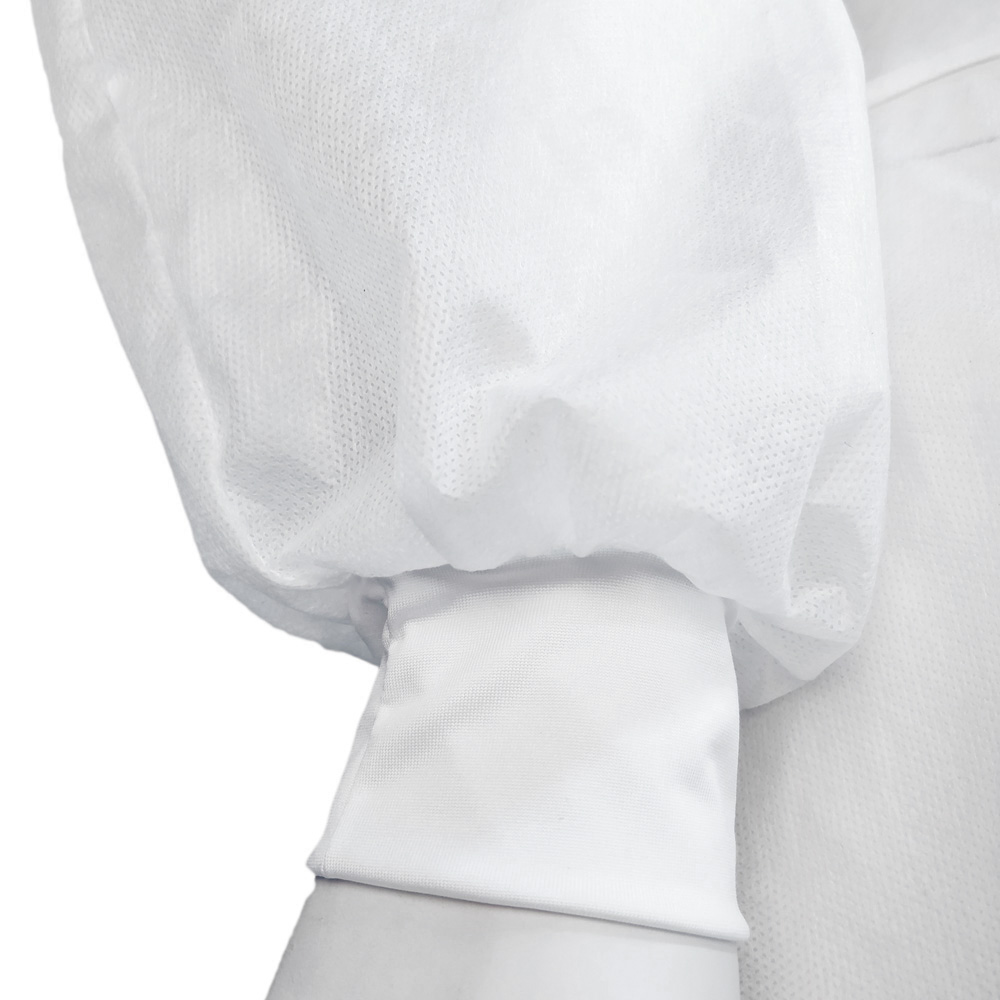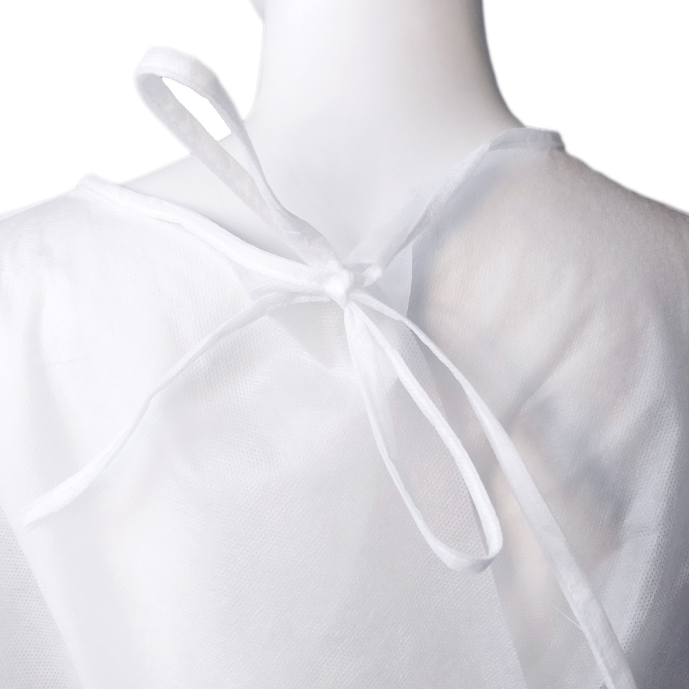 Fartuch ochronny wykonany z certyfikowanej tkaniny medycznej polipropylenowej, wiązany w dwóch punktach, elastyczne ściągacze w rękawach umożliwiają idealne dostosowanie i przyleganie do nadgarstków.