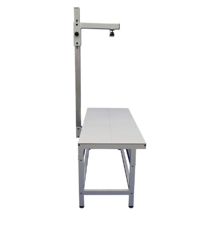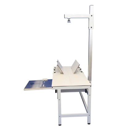 Stabilna i mocna konstrukcja. Profesjonalny stół weterynaryjny do badań RTG z wysięgnikiem i pozycjonerem w zestawie. Blat o wymiarach 1500 x 645 mm wykonany z Kartitu przepuszczający fale RTG. Wysięgnik ze stali nierdzewnej posiada regulację przechyłu oraz 13 ustawień wysokości ramienia. Ramię na aparat RTG można regulować również poprzecznie. Ruch ramienia został zsynchronizowany z samocentrującą szufladą na kasety, która porusza się pod blatem. Zestaw zawiera także pozycjoner z korekcją szerokości, bardzo przydatny przy prześwietlaniu bioder małych zwierząt. Regulowane nóżki stołu, pod blatem zaczepy do ustabilizowania pacjenta.