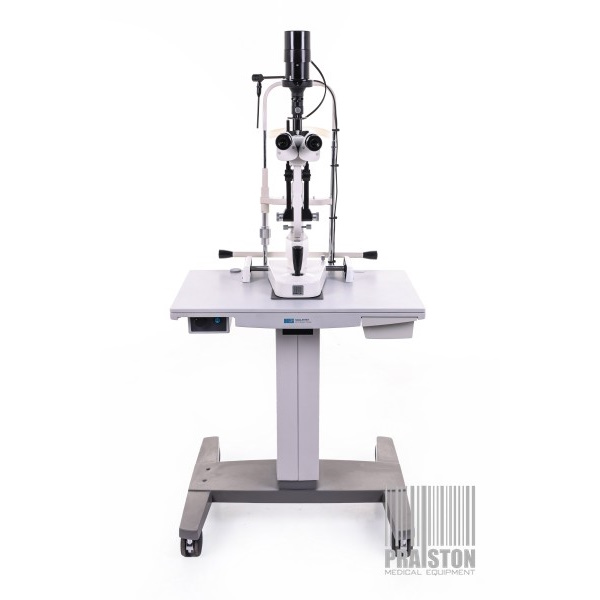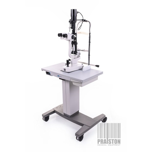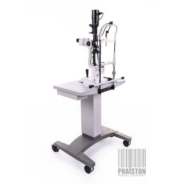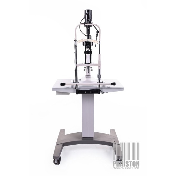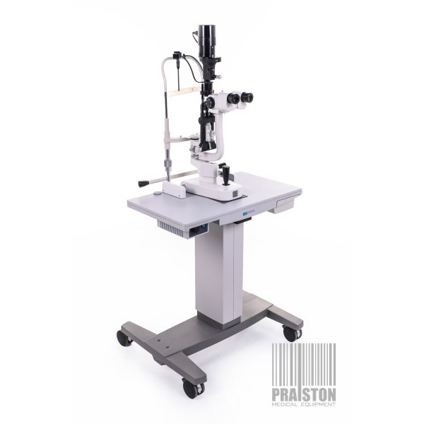 - Lampa szczelinowa umieszczona na mobilnym stoliku HAAG-STREIT z manualną regulacją wysokości blatu w zakresie 74 – 90 cm,