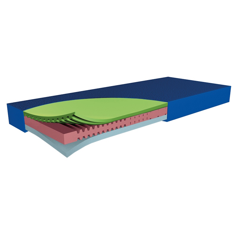 To wysokiej jakości dwuwarstwowy materac przeciwodleżynowy stosowany w terapii odleżyn do 3 stopnia (EPUAP). Dodatkowe wzmocnienia z pianki umieszczone po bokach materaca zapewniają większą stabilność i niwelują ryzyko powstawania odkształceń. Niepalna pianka z podłużnymi i poprzecznymi nacięciami zapewnia maksymalny komfort pacjenta, zapobiega powstawaniu odleżyn i odgrywa istotną rolę w leczeniu bólu. Poliuretanowy, wodoodporny pokrowiec uniemożliwia wnikanie cieczy do środka i zapewnia skórze odpowiedni komfort. Powierzchnia pokrowca zmniejsza tarcie i zapobiega uszkodzeniu tkanek. Materac przeznaczony jest dla pacjentów ze średnim ryzykiem wystąpienia odleżyn.