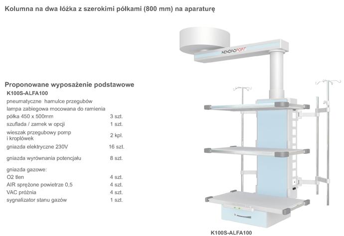Kolumna na dwa łóżka z szerokimi półkami 800 mm na aparaturę. Kolumna przeznaczona dla Oddział Intensywnej Terapii. Wyposażenie podstawowe: pneumatyczne hamulce przegubów, lampa zabiegowa mocowana do ramienia; półka 450x500mm 3 szt.; szuflada/zamek w opacji 1 szt.; wieszak przegubowy pomp i kroplówek 2 klp.; gniazda elektryczne 230V 16 szt.; gniazda wyrównywania potencjału 8 szt.; gniazda gazowe: 02 tlen 4 szt.; AIR sprężone powietrze 0,5 4 szt.; VAC próżnia 4 szt.; sygnalizator stanu gazów 1 szt.