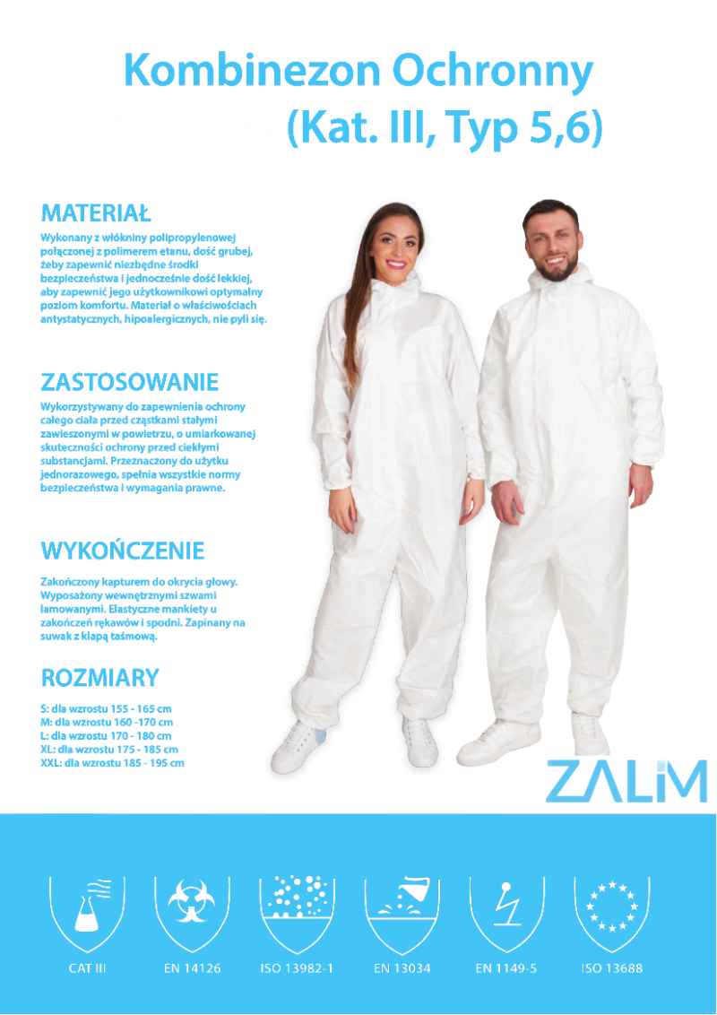 Wykorzystywany do zapewnienia ochrony całego ciała przed cząstkami stałymi zawieszonymi w powietrzu, o umiarkowanej skuteczności ochrony przed ciekłymi substancjami. Przeznaczony do użytku jednorazowego, spełnia wszystkie normy bezpieczeństwa i wymagania prawne.