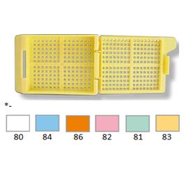 Kasetka biopsyjna z zamontowanym wieczkiem zamykanym na zawias. Małe kwadratowe otwory zapewniają wystarczającą wymianę odczynników oraz wysoki stopień przepojenia materiału przy jednoczesnym zabezpieczeniu drobnego materiału. Kasetka dostępna w różnych kolorach w kartonie z podajnikiem.