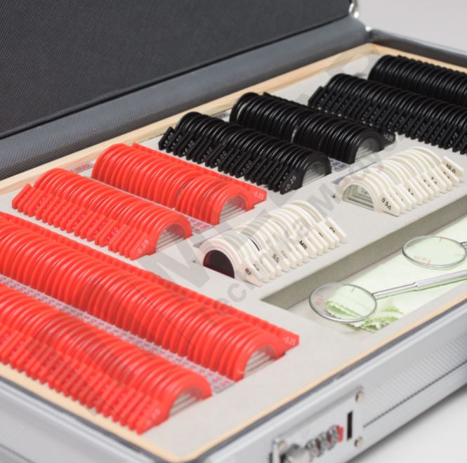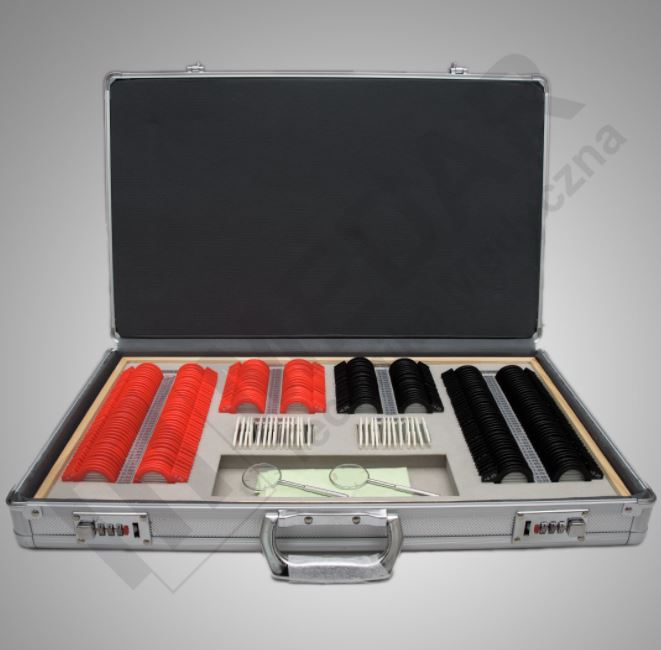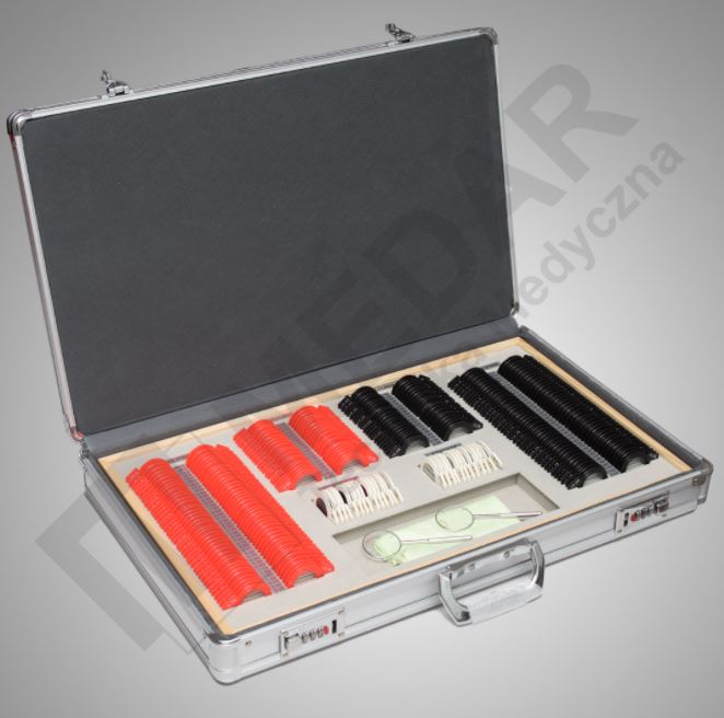 Kaseta okulistyczna zawierająca 266 elementów w solidnej walizce, dodatkowo organizer w środku na wszystkie elementy. Wysoka precyzja wykonania z zachowaniem dokładnych mocy soczewek, dokładnego centrowania osi optycznych oraz położenia osi cylindra. Soczewki w plastikowych obwódkach, dobrze oznakowane moce soczewek oraz osie cylindrów.
