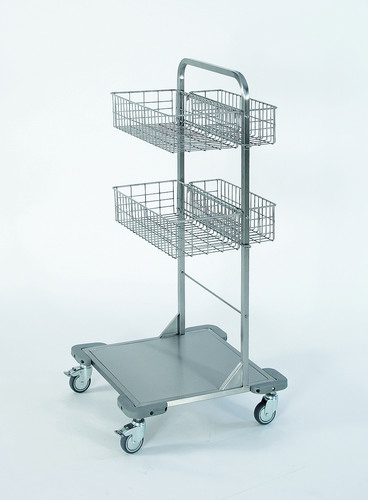 1x nierdzewna półka na podwoziu stojaka, 2x kosz nierdzewny 01511, 2x kosz nierdzewny 01512, 4x obrotowe koła d=7,5 cm, w tym 2 z nich z hamulcem