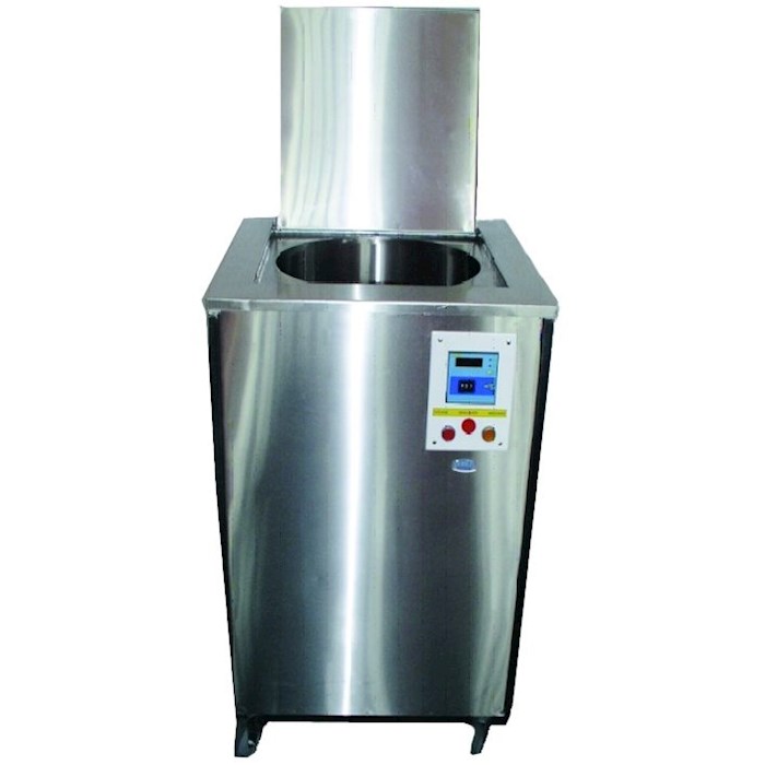 Urządzenie PMB-1 służy do podgrzewania, mieszania i utrzymywania w zadanej temperaturze masy borowinowej służącej do wykonywania okładów przy zabiegach ciepłoleczniczych. Podgrzewacz wykonano w formie wolnostojącej szafy z możliwością przemieszczania (kółka). Całość jest ze stali chromoniklowej polerowanej. Urządzenie składa się ze zbiornika na masę borowinową o podwójnym płaszczu wypełnionym wodą podgrzewaną grzałkami elektrycznymi sterowanymi regulatorem temperatury. Dla uzyskania równomiernego rozkładu temperatury zastosowano mieszadło obrotowe napędzane silnikiem elektrycznym z motoreduktorem. Urządzenie posiada zabezpieczenia przed pracą mieszadła przy otwartej pokrywie oraz pracą grzałek na sucho (bez wody w płaszczu wodnym) i przegrzaniem masy borowinowej (ok 80°C). W części tylnej za pokrywą znajduje się skrzynka z elementami automatyki i zasilania. Do sterowania funkcjami urządzenia służy pulpit sterowniczy umieszczony na ścianie czołowej.