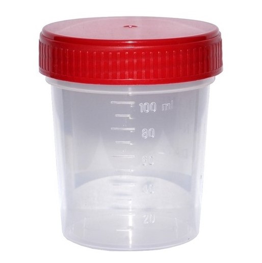 Pojemnik na mocz PP z czerwoną, niezakręconą nakrętką, niejałowy, 120ml, 500szt/karton