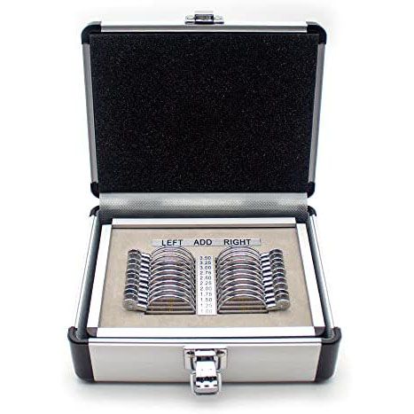 Kaseta 22 szkła próbne progresywne w kasecie metalowej, w metalowej oprawie. Pole widzenia przez soczewkę 36 mm, średnica całkowita soczewki wraz z ramką 38 mm.