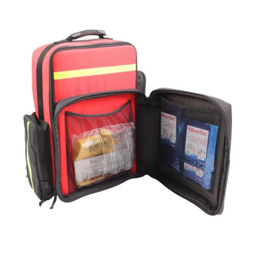 - w przedniej kieszeni frontalnej otwieranej w kształcie litery “C” znajdują się dwie kieszenie siatkowe na zestaw hydrożeli oraz ssak ręczny i rurki ustno-gardłowe,
