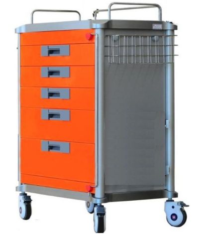 Wózek opatrunkowy : Wysokość: 970 cm. 5 szuflad z centralnym zamkiem. Dodatkowy roboczy wysuwany blat boczny, trzy szuflady z podziałką wewnątrz, kosz metalowy (druciany) na akcesoria. Wózek opatrunkowy przeznaczony jako wyposażenie: - oddziałów anestezjologicznych, - szpitalnego oddziału ratunkowego, - sal szpitalnych, Wózek Opatrunkowy. Wymiary: - Szerokość: 650 mm, - Głębokość 475 mm, - Wysokość: 970 mm. Wykonanie wózka: Konstrukcja wózka opatrunkowego wykonana ze stopu aluminiowego. Trzy uchwyty do przetaczania wózka umieszczone na blacie głównym po bokach i z tyłu wózka. Uchwyt stanowią także zabezpieczenie przed zsuwaniem się pojemników z blatu roboczego. - Wózek opatrunkowy pięcio szufladowy, - górny blat roboczy wykonany ze stali nierdzewnej, - płyta tylnia i boczne: wykonane z aluminium, - Fronty szuflad wykonane ze stopu aluminiowego, - uchwyty szuflad wykonane z ABS, - Trzy szuflady wyposażone w wyciągane podziałki służące odpowiedniej segregacji leków, - maxymalna nośność szuflady 50 kg, - całkowita ładowność wózka 200kg., - odporność na korozję i łatwe czyszczenie, - Centralny zamek zamykający wszystkie szuflady (zamek umieszczony z prawej strony wózka), - Wózek wyposażony jest w 4 cichobieżne kółka (o średnicy ?100mm) każde z blokadą jazdy. Wyposażenie standardowe (w cenie z tabelki): - dwa kosze plastikowe, - dodatkowy wysuwany blat roboczy z boku wózka, - druciany kosz na akcesoria medyczne.