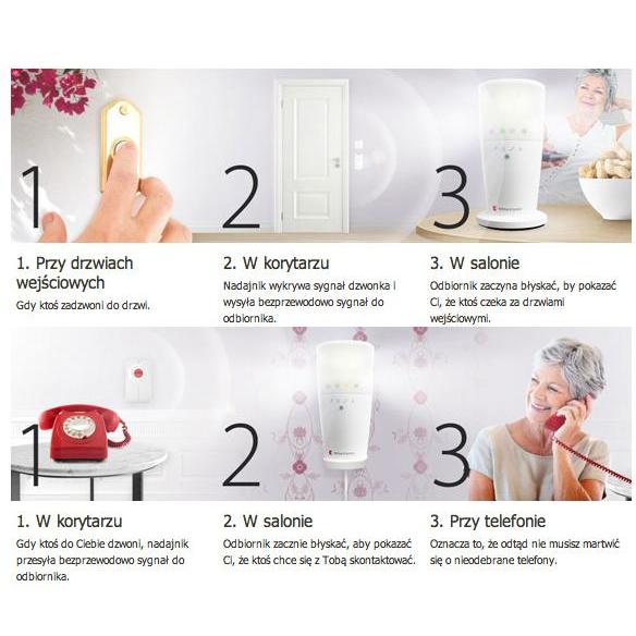 Firma Bellman & Symfon opracowała system domowej sygnalizacji. System ten powiadomi Cię jasnym błyskającym światłem o dzwonku do drzwi lub dzwoniącym telefonie – nawet wtedy, gdy znajdujesz się w pokoju odległym od drzwi lub telefonu.