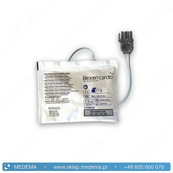 Elektrody wielofunkcyjne, jednorazowe do defibrylacji, kardiowersji, stymulacji oraz monitorowania EKG - komplet z wystającym kablem oraz wtyczką (do wstępnego podłączenia z defibrylatorem hermetycznie zamkniętych elektrod).