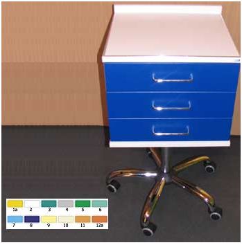 Asystor stomatologiczny - trzy szufladowy o wymiarach 45cm x 45cm oraz wysokość 75 do 90 cm. Wysokość asystora regulowana sprężyną gazową, chromowana noga. Wykończenie obrzeży specjalnym tworzywem zapewniającym dużą trwałość oraz solidność. Masa 30kg. Szuflady asystora są puste, w kolorze białym. Istnieje jednak możliwość dokupienia wkładek plastikowych, oraz górnej tacy metalowej.