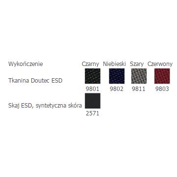 Krzesło ESD wyposażone w dźwignie regulacji siedziska i oparcia obite przewodzącym materiałem (Rg< 106 Ω). Krzesło posiada pięcioramienną podstawę wykonaną ze spłaszczonej stalowej rury pokryta żywicą epoksydową. Zapewnia to dużą stabilność i niezawodne odprowadzanie ładunku elektrostatycznego. Wszystkie krzesła są dostarczane z czarną ramą.