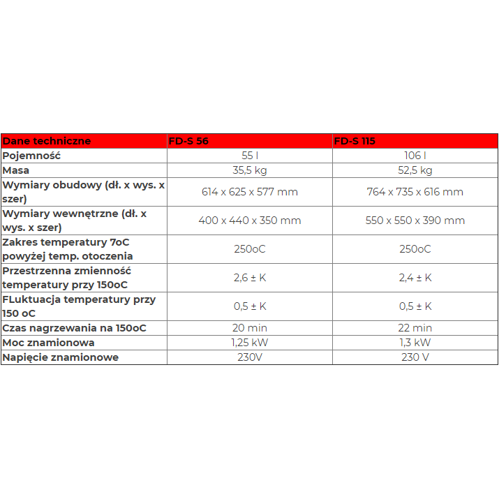 | FD-S 115 | 106 l | 550 x 550 x 390 (dł. x wys. x szer.) | 52,5 kg |